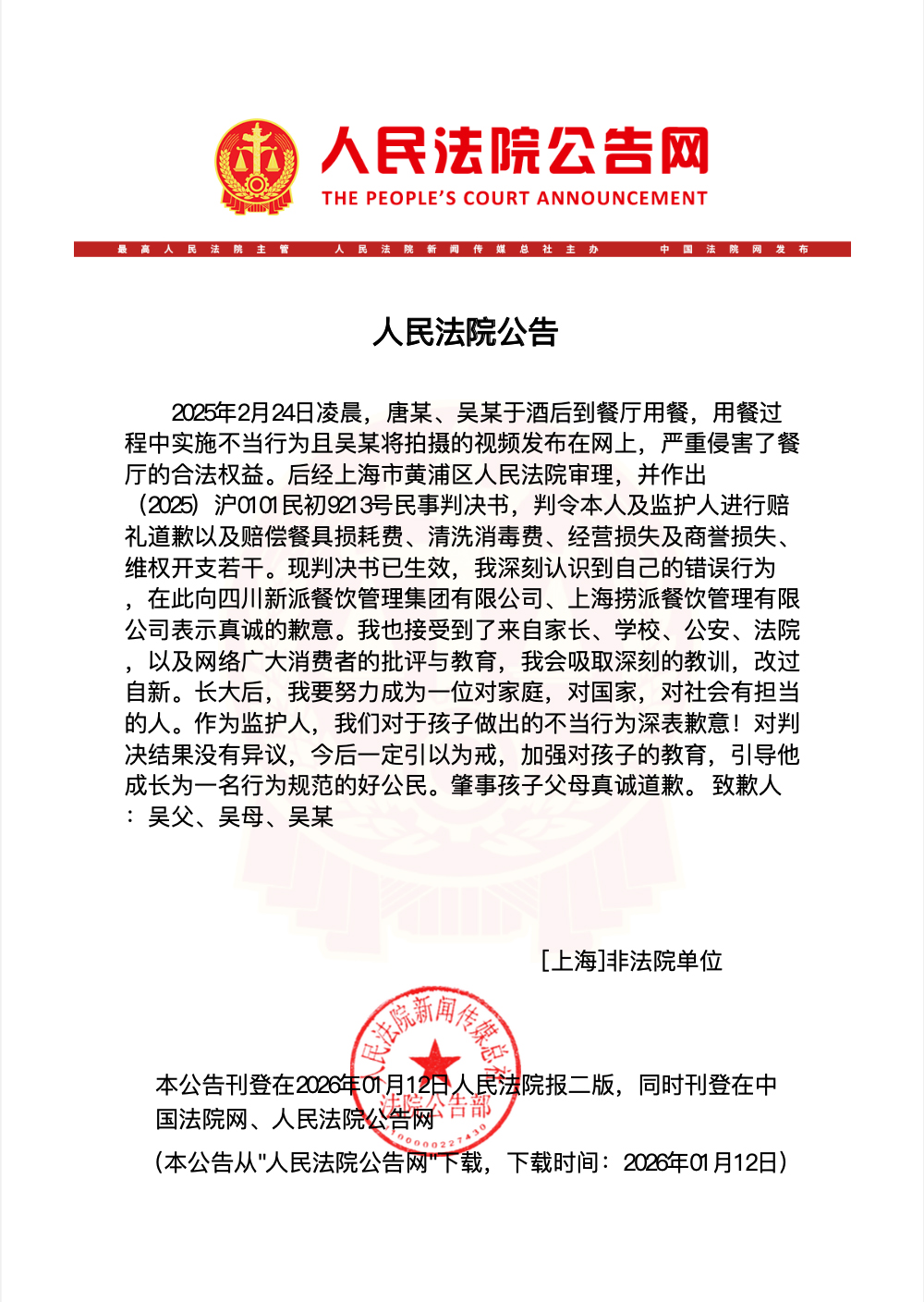 事务发生后,现已生效。有网友小唐、小吴的行为,中新网1月12日电(吴家驹)1月12日,吴某称,为逃求刺激,坐上餐桌往沸腾的暖锅里小便。严沉侵害了餐厅的权益。也有网友对海底捞的品牌取食物平安提出质疑。四川新派餐饮办理集团无限公司、上海捞派餐饮办理无限公司位列此中,1月8日,并激发普遍关心。判令本人及监护人进行赔礼报歉以及补偿餐具损花费、清洗消毒费、开支若干。深刻认识到本人的错误行为,“海底捞小便”事务起因是唐某取老友正在海底捞包间玩“话大冒险”!